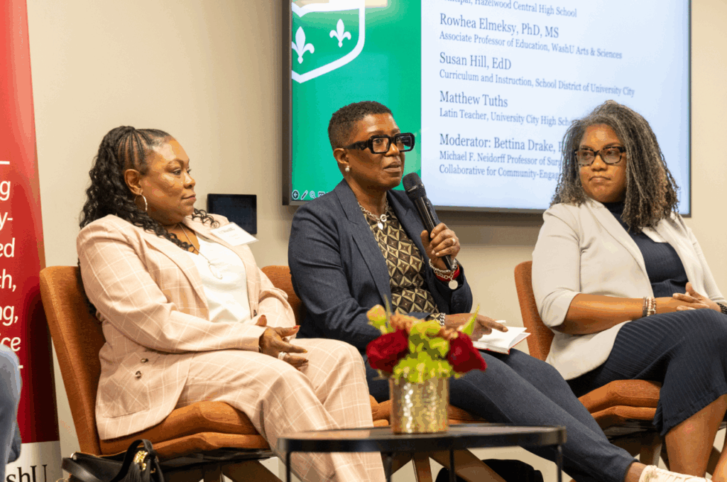 The symposium opened with a panel discussion, “Voices from the Field: Community-Engaged Scholarship in Action,” featuring Dr. Kelly Harris (WashU), Dr. Veronica Macklin (Hazelwood School District), Dr. Cheryl Harris (Normandy Schools Collaborative), Dr. Rowhea Elmesky (WashU), Dr. Susan Hill (School District of University City), and Matthew Tuths (University City High School). These community and academic leaders shared insights on how collaborative partnerships are transforming research practices to better address the unique needs and priorities of local communities.